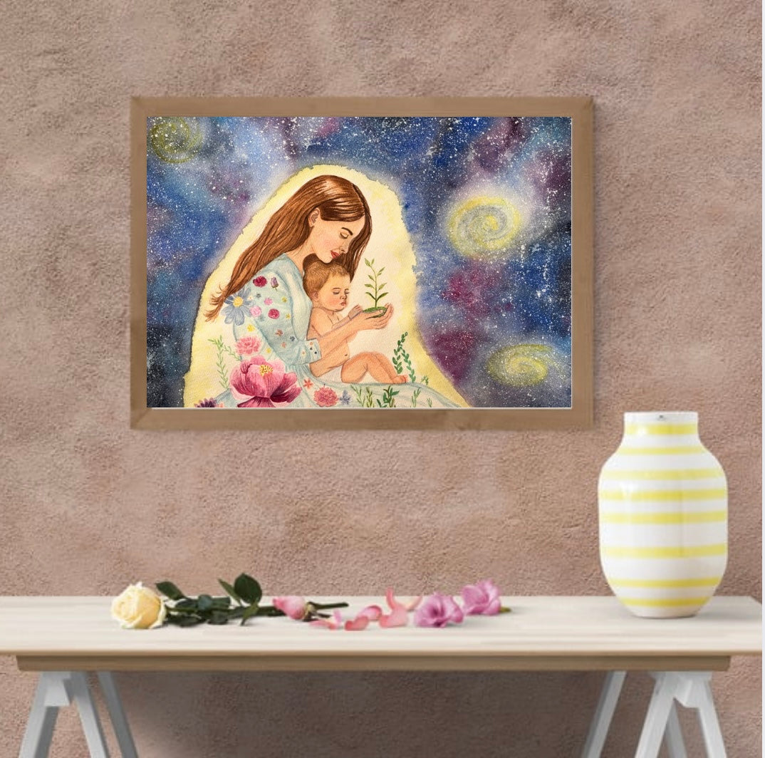 A delicate watercolour capturing a moment of quiet connection between mother, child and the universe. The mother is adorned with flowers and gently holds a tiny plant in her hands, with a soft aura radiating from them into the surrounding space. The illustration evokes care, growth, and the gentle magic of human connection.